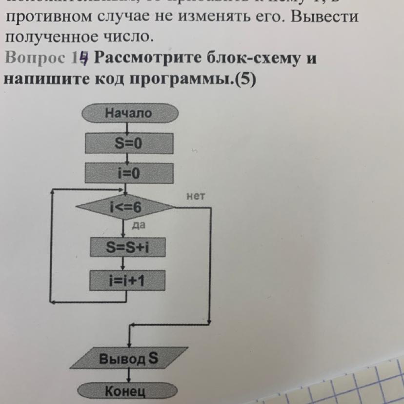 while i <= 6 означает пока переменная i меньше или равна 6. В цикле прибавляем к S i, а к i 1.