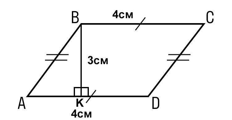 У паралелограмі ABCD до сторони AD проведено висоту ВК. Знайдіть площу паралелограма, якщо ВС = 4 см, ВК= 3 см.