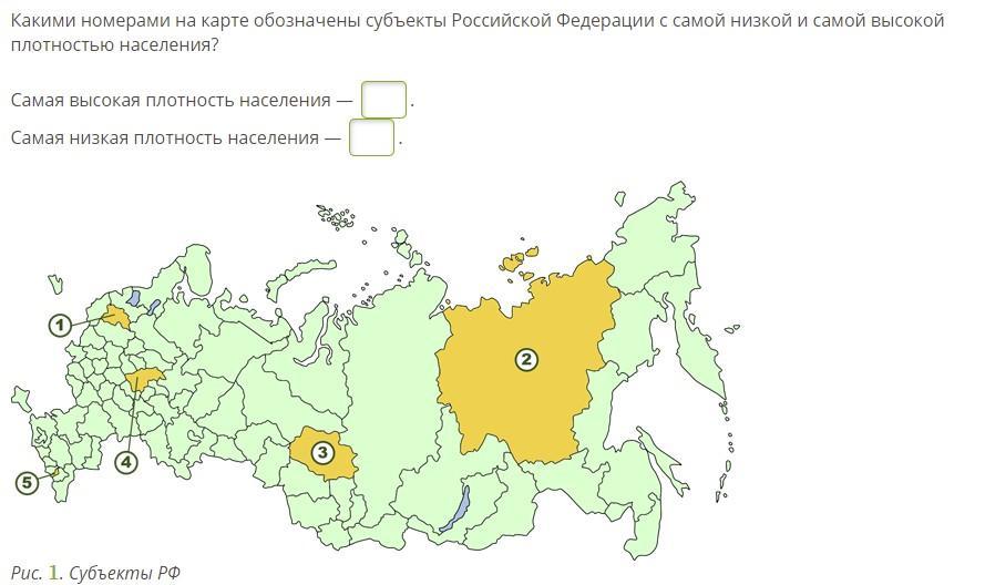 - Субъекты Российской Федерации с самой низкой плотностью населения-2, самой высокой плотностью населения-5