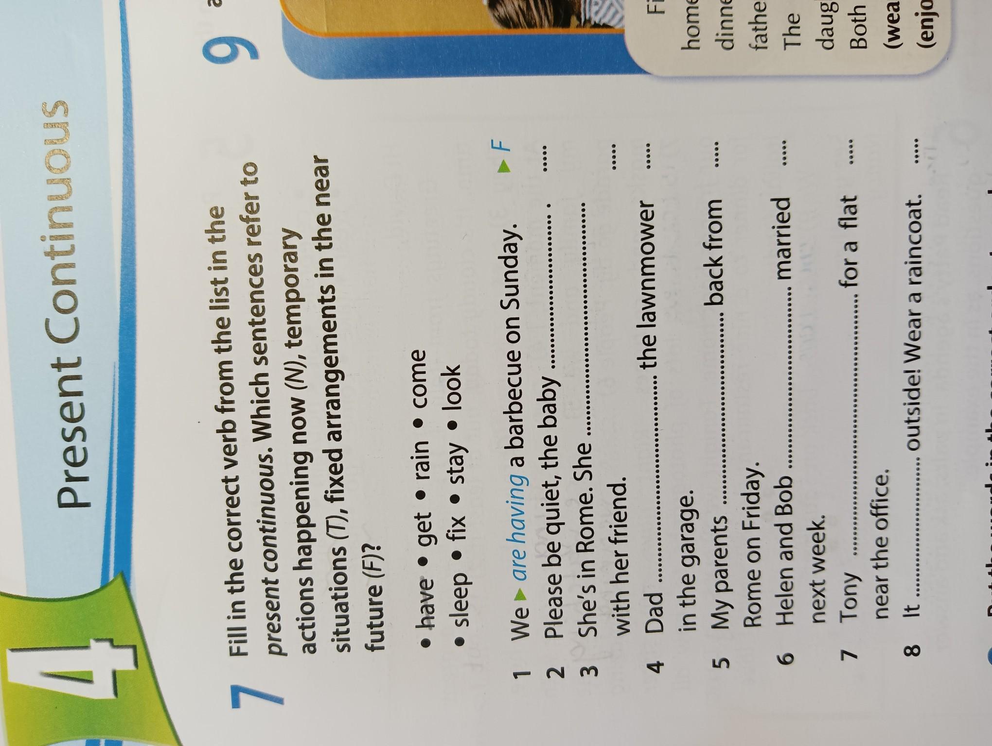 2) Please be quiet, the baby is sleeping. 3) She is in Rome. She will stay with her friend. 4) Dad is fixing the lawnmower in the garage. 5) My parents will come back from Rome on Friday. 6) Helen and Bob will get married next week. 7) Tony is looking for a flat near the office. 8) It is raining outside! Wear a raincoat.