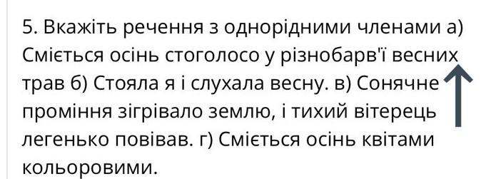 5. Вкажіть речення з однорідними членами а) Сміється осінь стоголосо у різнобарв'ї весних трав б) Стояла я і слухала весну. В) Сонячне проміння зігрівало землю, і тихий вітерець легенько повівав. г) Сміється осінь квітами Кольоровими.