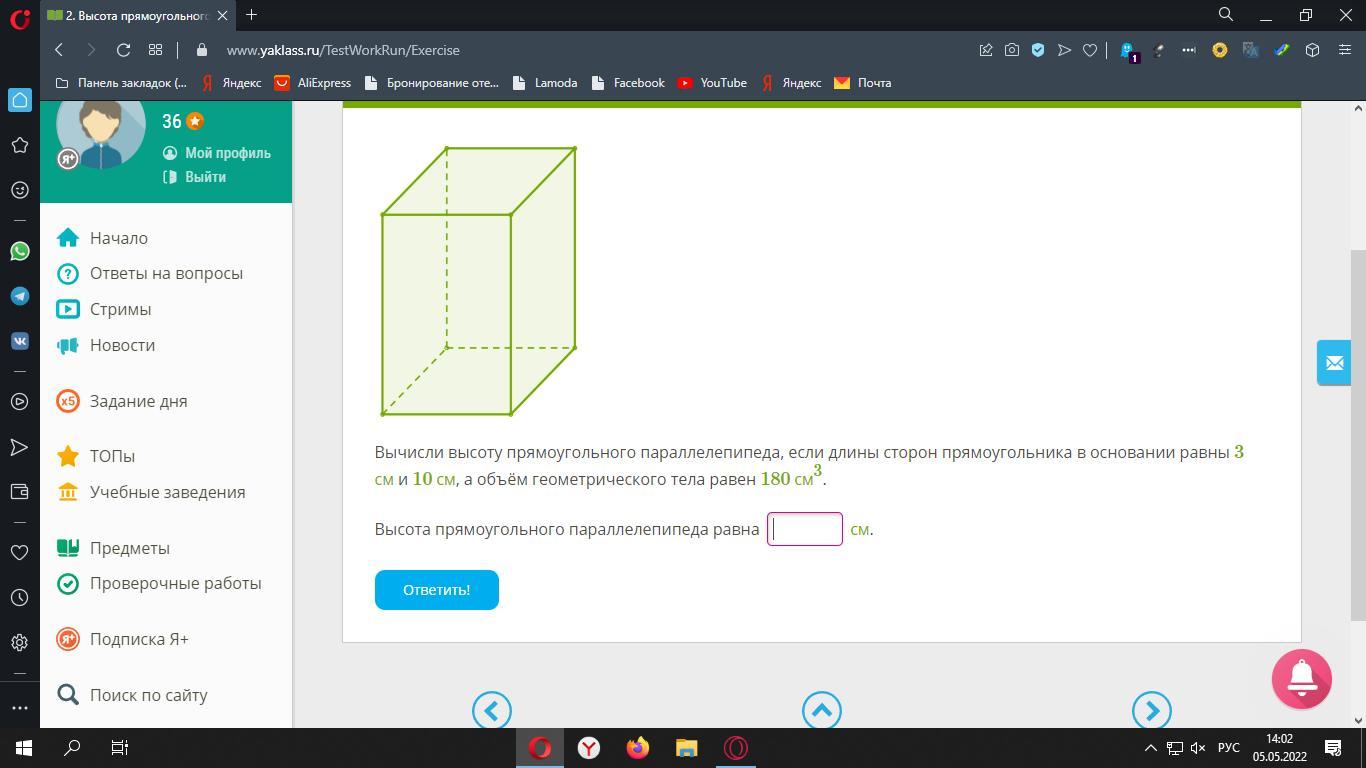 Нам извесны длина и ширина, а также объем. Тогда высота =объем/(высота*ширина)=180\(10*3)
