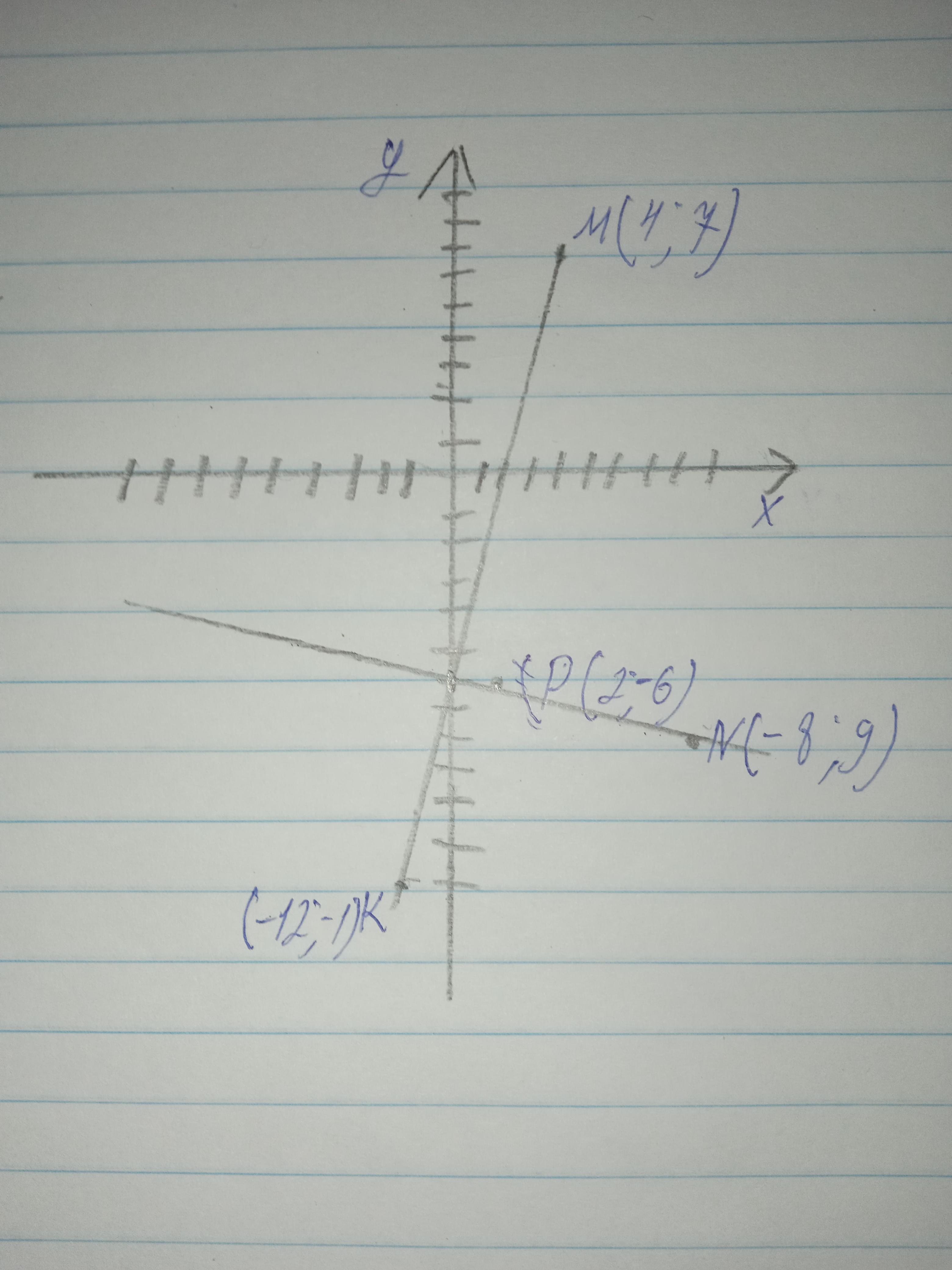 Позначте на координатній площині точки M(4;7), N(-8;9), K(-12;-1) і P(2;-6). Проведіть прямі MK i NP. Знайдіть координати перетину цих прямих.