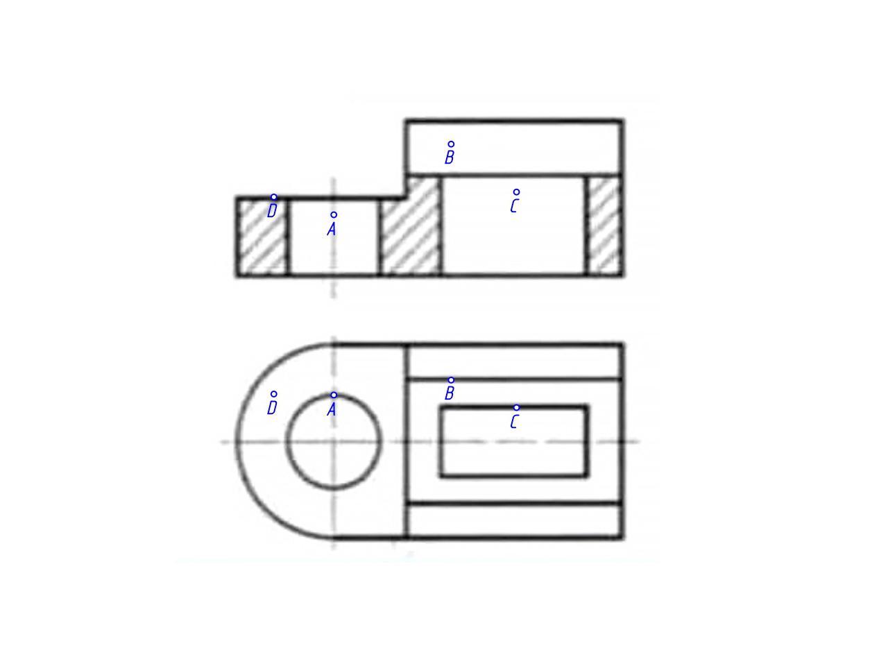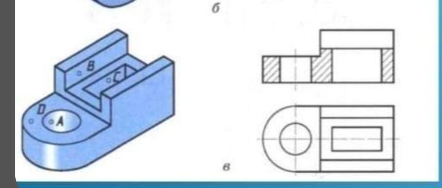 На рисунке 165 зображение наглядны изображения предметов, их виды и разрезы. Начертите или перенесите на прозрачную бумагу вид и разрез предмета. Постройте на них проекции точек, обозначенных на наглядных изображениях буквами.