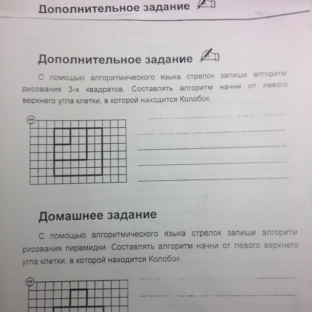С помощью алгометрического языка стрелок запиши алгоритм рисования 3-х квадратов. Составить алгоритм начни от левого верхнего угла клетки , в которой находится колобок