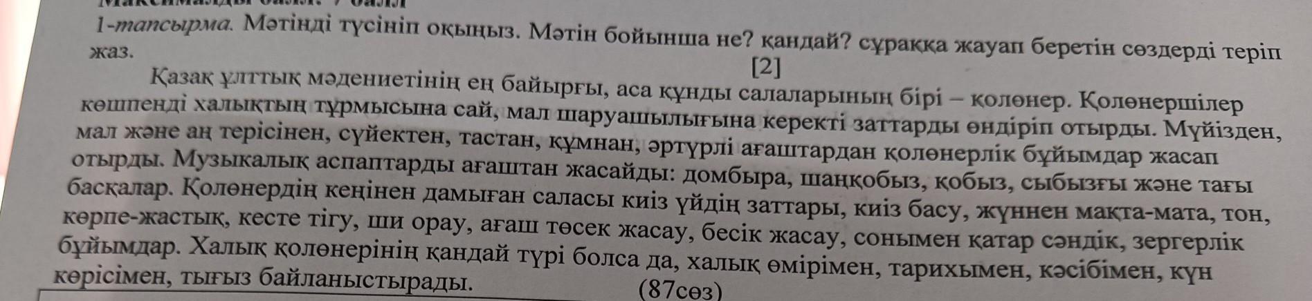 Қандай? : Ұлттық , байырғы , аса , құнды , көшпенді , сай , әртүрлі , қолөнерлік , сәндік , зергерлік , тығыз .