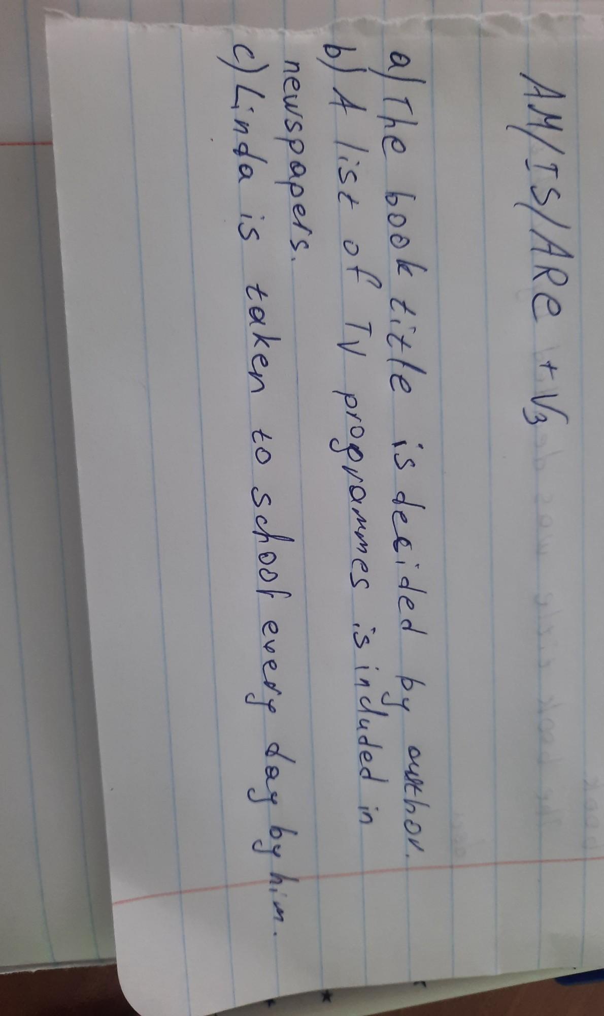 2. Rewrite these sentences. Use the present simple passive. In Britain lots of people read newspapers. Example: Newspapers Newspapers are read by lots of people in Britain. a) The author decides the title of the book. b) Newspapers include a list of TV programmes. c) He takes Linda to school every day.