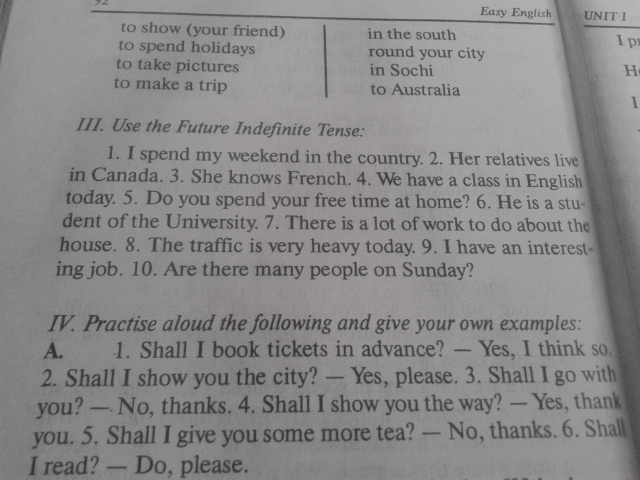 I shall spend my weekend on the country. His relatives will live in Canada. She will know French. We shall have a class in English tomorrow. Will you spend your free time at home? He will be a student of the University. There will be a lot of work to do about the house. The traffic will be very heavy tomorrow. I shall have an interesting job. Will there be many people on Sunday!