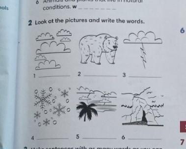 1.clouds 2. a bear 3. thunder 4. snowflakes 5. a beach 6. a cave