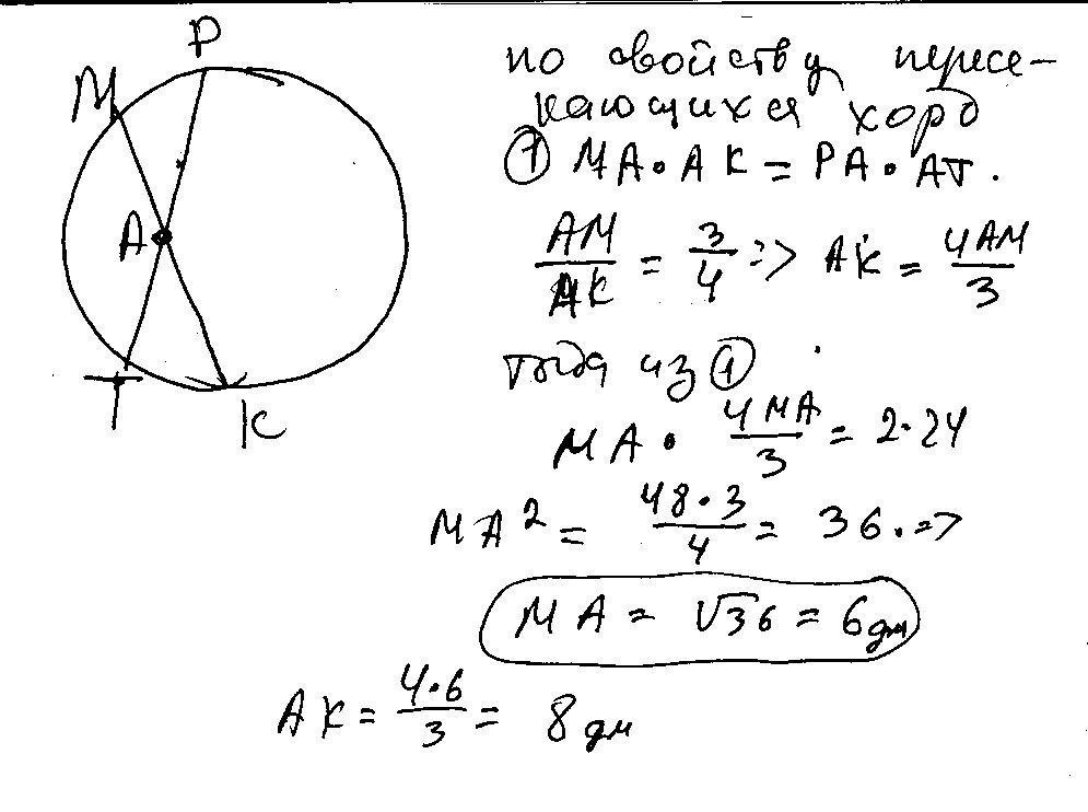 Хорды МК и РТ пересекаются в точке А. Найдите длину АМ, если АР = 2 дм, АТ = 24 дм, АМ : КА = 3 : 4.