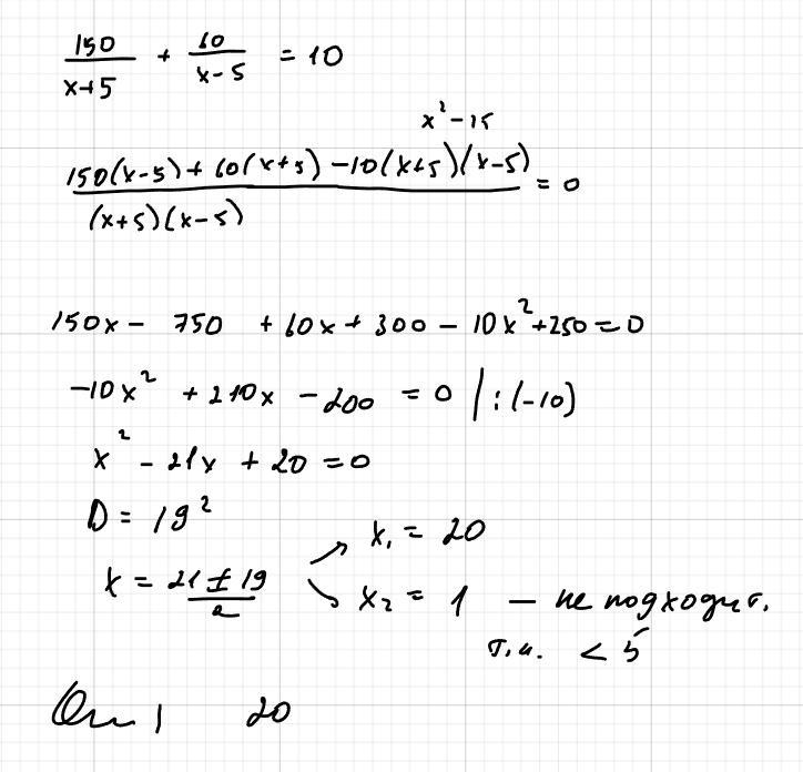 катер прошел по течению реки 150 км, а против течения реки 60 км. Найти собственную скорость катера, если скорость течения реки 5 км/ч и на весь путь он затратил 10 часов.