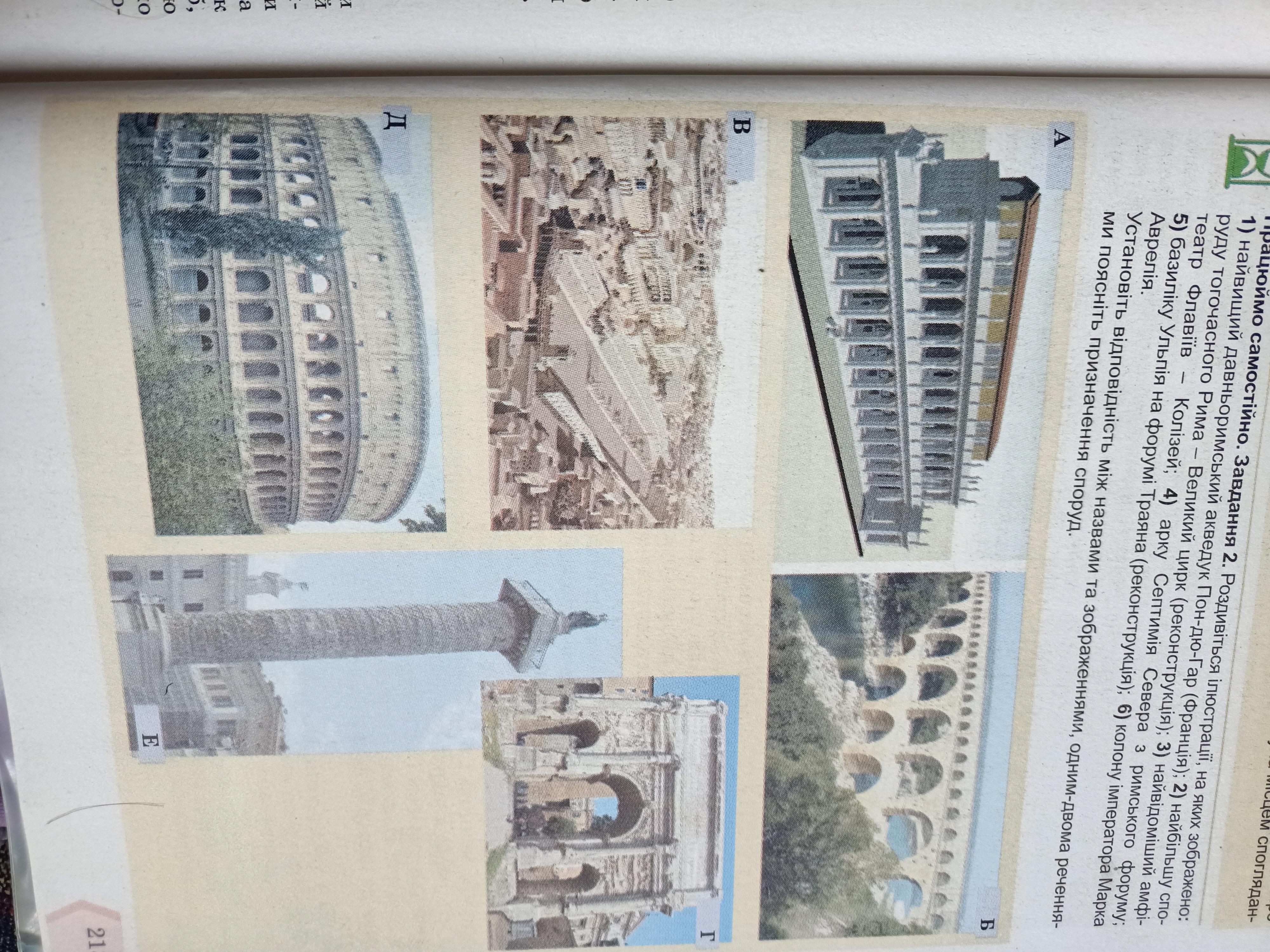 Можно ответ? Роздивіться ілюстрації на яких зображено найвищий давньоримський акведук пон-дю-гар Франція найбільшу споруду тогочасного риму великий цирк реконструкція найвідоміший амфітеатр флавіїв Колізей арку септимія севера з Римського форуму базиліку ульпія на форумі траяна реконструкція колона імператора марка аврелія встановіть відповідність між назвами та зображеннями одним-двома реченнями поясніть призначення споруд