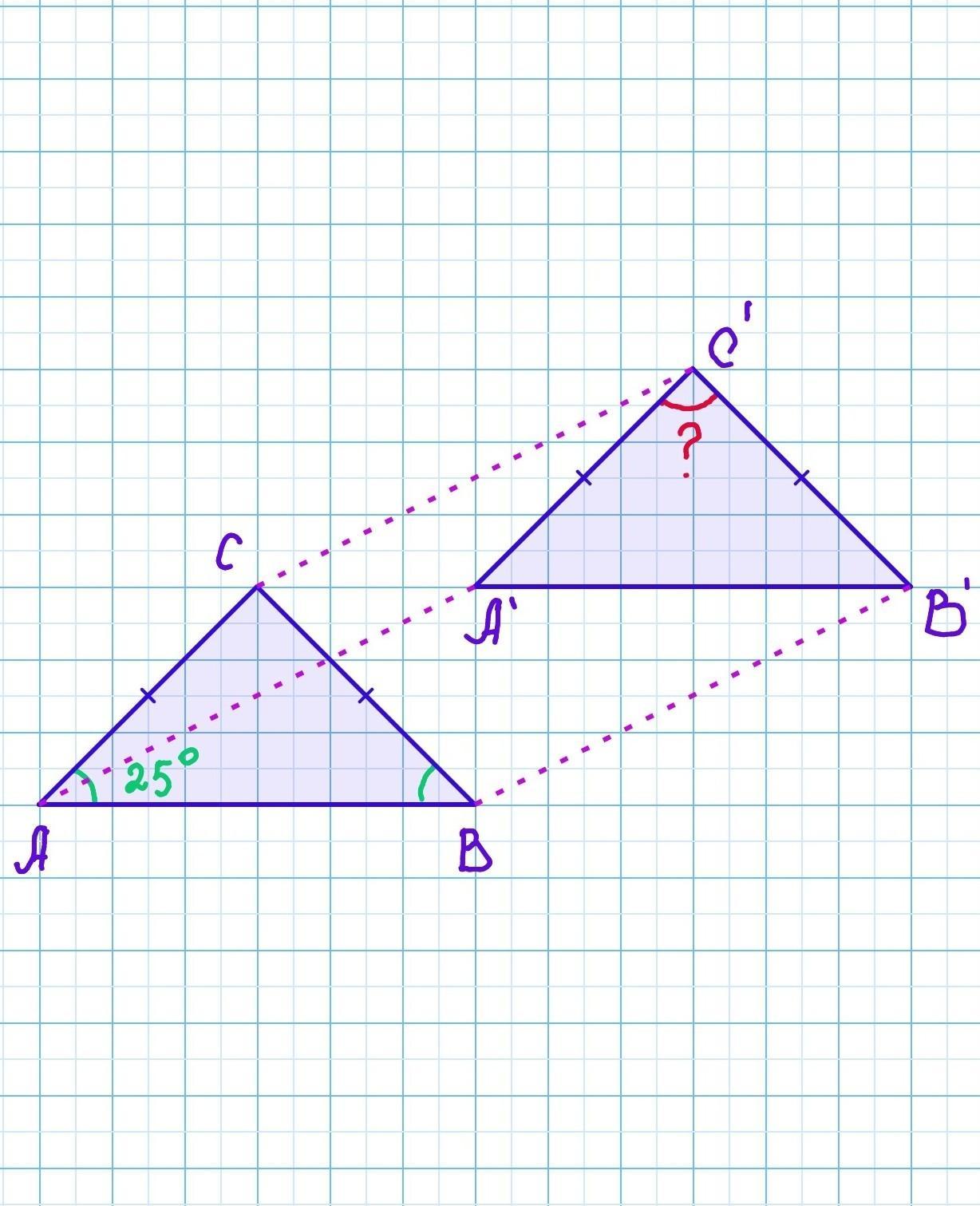 Рiвнобедрений трикутник АВС з основою AB при переміщенні перейшов у трикутник А'В'С'. Знайдіть величину кута <C', якщо <A = 25°.