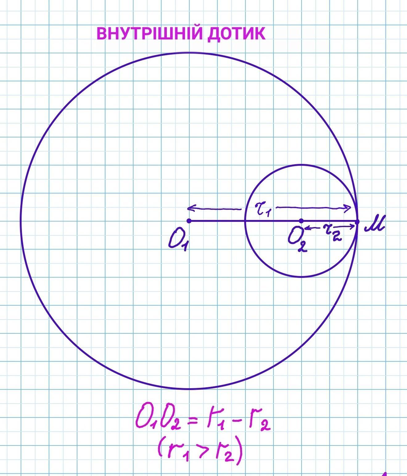 - Якщо центри кіл розміщені по один бік від спільної точки ( точки дотику ), то дотик називають внутрішнім.