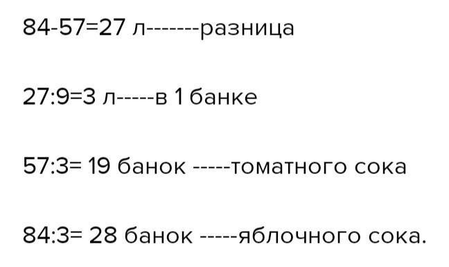 На зиму заготовили сок в одинаковых банках: 57 л томатного сока и 84 л яблочного. Яблочного сока получилось на 9 банок больше, Сколько заготовили томатного сока и сколько яблочного?