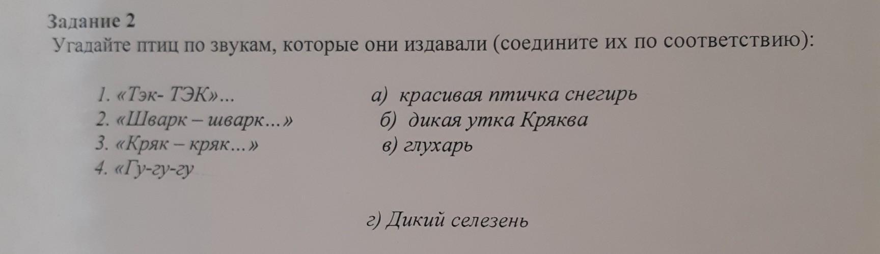 Задание 2 Угадайте птиц по звукам, которые они издавали (соедините их по соответствию): 1. «Тэк- ТЭК»... 2. «Шварк - шварк...» 3. «Кряк - кряк... » 4. «Гу-гу-гу а) красивая птичка снегирь б) дикая утка Кряква в) глухарь г) Дикий селезень
