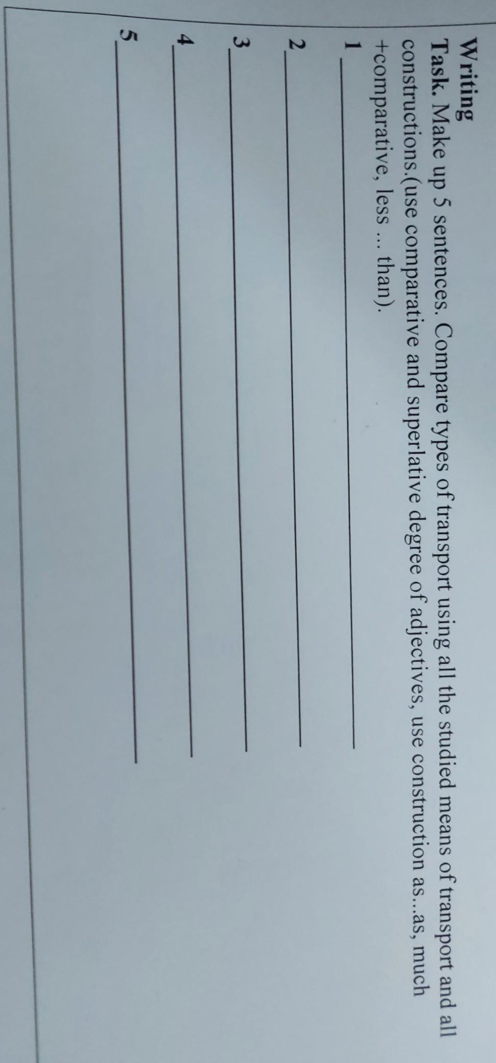Writing Task. Make up 5 sentences. Compare types of transport using all the studied means of transport and all constructions.(use comparative and superlative degree of adjectives, use construction as...as, much +comparative, less ... than).