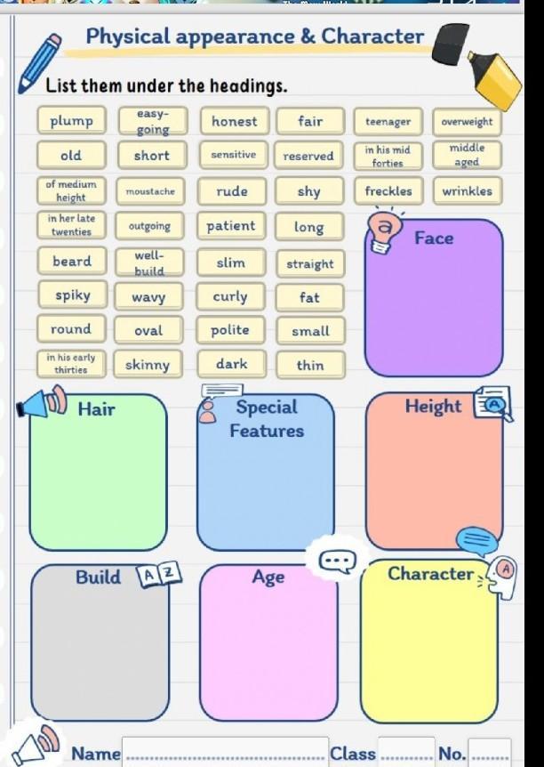 CHARACTER: easy-going, rude, outgoing, straight, wavy, polite, shy, sensitive, reserved, patient, honest.