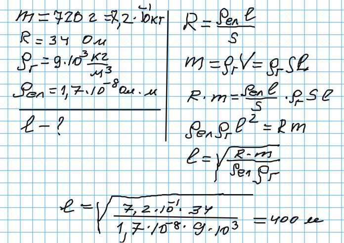 HELP! маса мідного провідника становить 720 г, його електричний опір дорівнює 34 Ом. Визначте довжину провідника. Вважайте, що густина міді дорівнює 9000кг/м3,а питомий опір міді 1.7*10-8 Ом*м