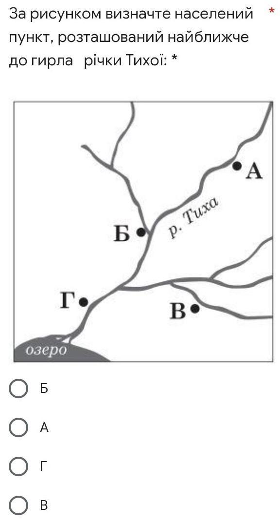 ДОПОМОЖІТЬ БУДЬ ЛАСОЧКА!!!!ДОПОМОЖІТЬ ЗРОБИТИ ТЕСТ З ГЕОГРАФІЇ!!! ДУЖЕ ПРОШУ!!! ХЕЛП!!! ДОПОМОЖІТЬ БУДЬ ЛАСКА!!! ДАЮ БАГАТО БАЛІВ!!! 1. Місце де річка впадає в океан,море,озеро чи в іншу річку? а) затока б) гирло в) тераса г) витік 2. Вкажіть назву кам'яних брил, що виступають з води у річках і виникли завдяки виходам твердих порід? а) пороги б)канали в)тераси г)морени 3. Яка корисна копалина утворюється в болотах? а)золото б)нафта в)торф г)кам'яна сіль 4.Укажіть найбільше за площею озеро світу? а) Каспійське море-озеро б) Bepxнє в) Аральське море-озеро г)Вікторія 5. Які розрізняють болота залежно вiд живлення? а) прiснi, солоні б) верхові, низинні, перехідні в) великі, малі г) тектонічні, вулканічні, льодовикові, заплавнi 6. Укажіть назву межі між басейнами сусідніх річок: а)поріг б)вододіл в)хребет г)горст 7. Яке море є внутрiшнiм? а) Червоне б) Аравiйське в) Берiнгове г) Карибське 8. Укажіть складові частини річкової системи: а)головна річка, праві притоки, ліві притоки б) рiчка, її басейн, вододіл в)витік, річище, гирло г)річище, заплава, тераса 9. Укажіть твердження, яке є визначенням поняття "басейн річки": а) Територія, з якої річка з притоками збирає води для живлення б) велика заглибина, уздовж якої протікає річка в)частина річкової долини, заповнена водою г) територія, яку заливає річка під час повені або паводка 10. Укажіть, як називають раптовий підйом води в річці в будь-який час: а) паводок б) ПОВІНЬ в) потоп г) межень 11.Укажіть твердження, яке є визначенням поняття "багаторічна мерзлота": а) покривні льодовики в Арктиці й Антарктиці б) землі, розміщені вище за снігову лінію в) верхній шар землі, який постійно має температуру, нижчу, ніж 0° С і містить пiдземний лід г) середньорічна товщина промерзання земної поверхні 12.Як називається найсолоніше озеро у світі? а)Каспійське б)Балхаш в)Байкал г)Мертве 13. Падіння води з скелястого уступу, утвореного в річищі, є: а) каналом б) терасою в) водоспадом г) порогом 14. Водопроникною породою є: а) пісок б) глина в) граніт г) мармур 15. Укажіть, як називають найнижчий рівень води в річцi: а) ПОВІНЬ б) потоп в) паводок г) межень 16. Напрямок та характер течії річки залежить передусім від: а) режиму живлення б) типу ґрунтів в)рельєфу місцевості г)кліматичних умов 17. Укажіть твердження, яке є визначенням поняття "рiчка": а) Водний потік на поверхні суходолу, що забезпечує водою водних тварин б) ВОДНИЙ ПОТІК на земній кулі, який рухається під впливом постійного вітру в) постійний водний потік на поверхні суходолу, який рухається у виробленій ним заглибині 18. Острiв, який вкритий покривним льодовиком: а) Пасхи б) Мадагаскар в) Нова Гвінея г) Гренландія 19. фото