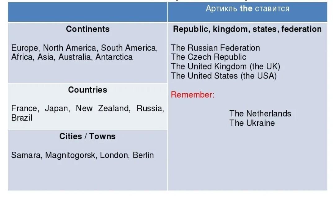 с названиями всех водных объектов, без их обозначения пишется the(тоесть если Волга, то the volga, а если река Волга, то river volga) горы во мн. ч., острова, пустыни, без их обозначения всë the , со странами посложнее, в фото