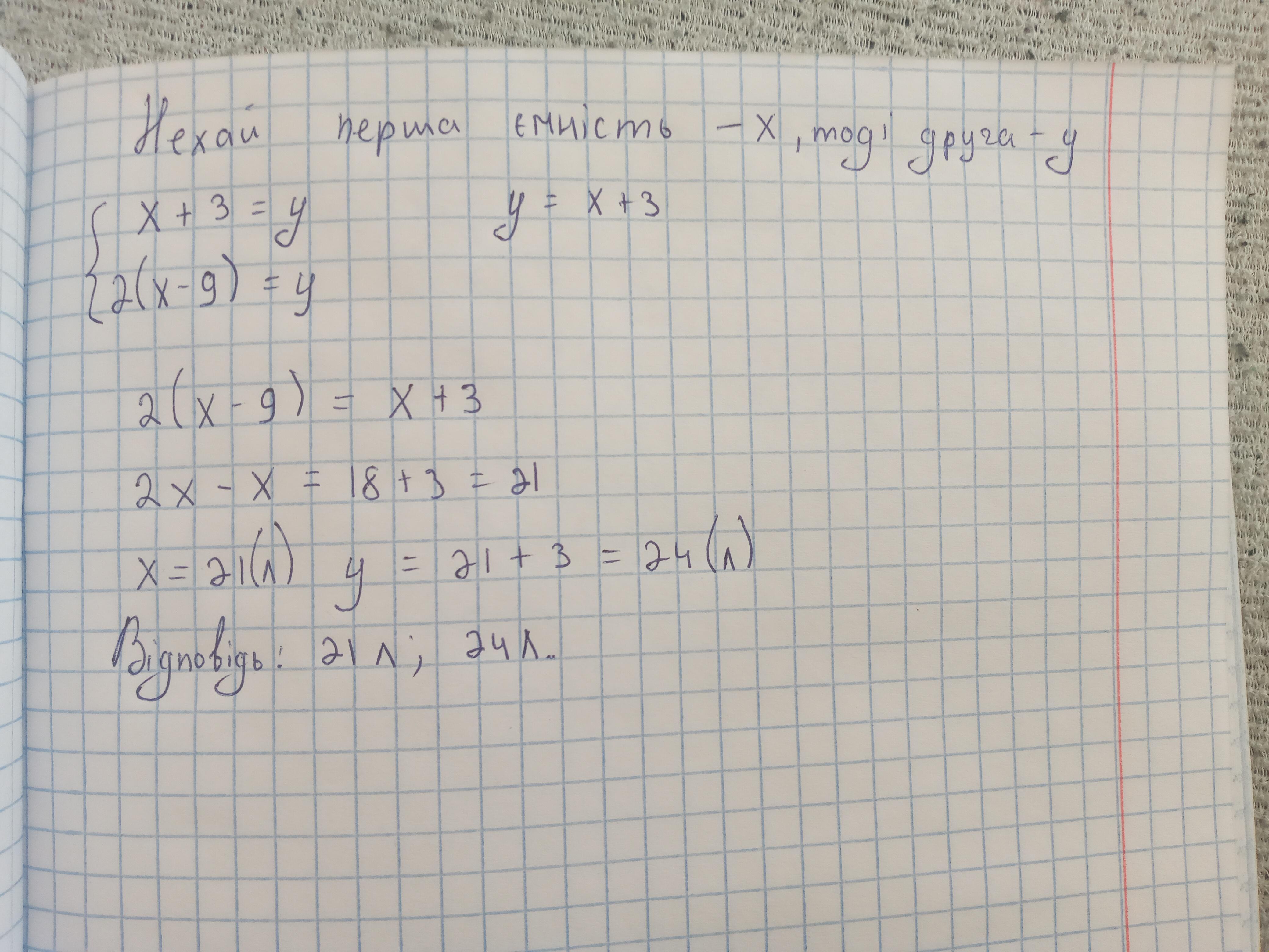 Якщо з першої ємності перелити в другу 9 л води, тоді у другій ємності стане у 2 рази більше, ніж залишиться у першій.