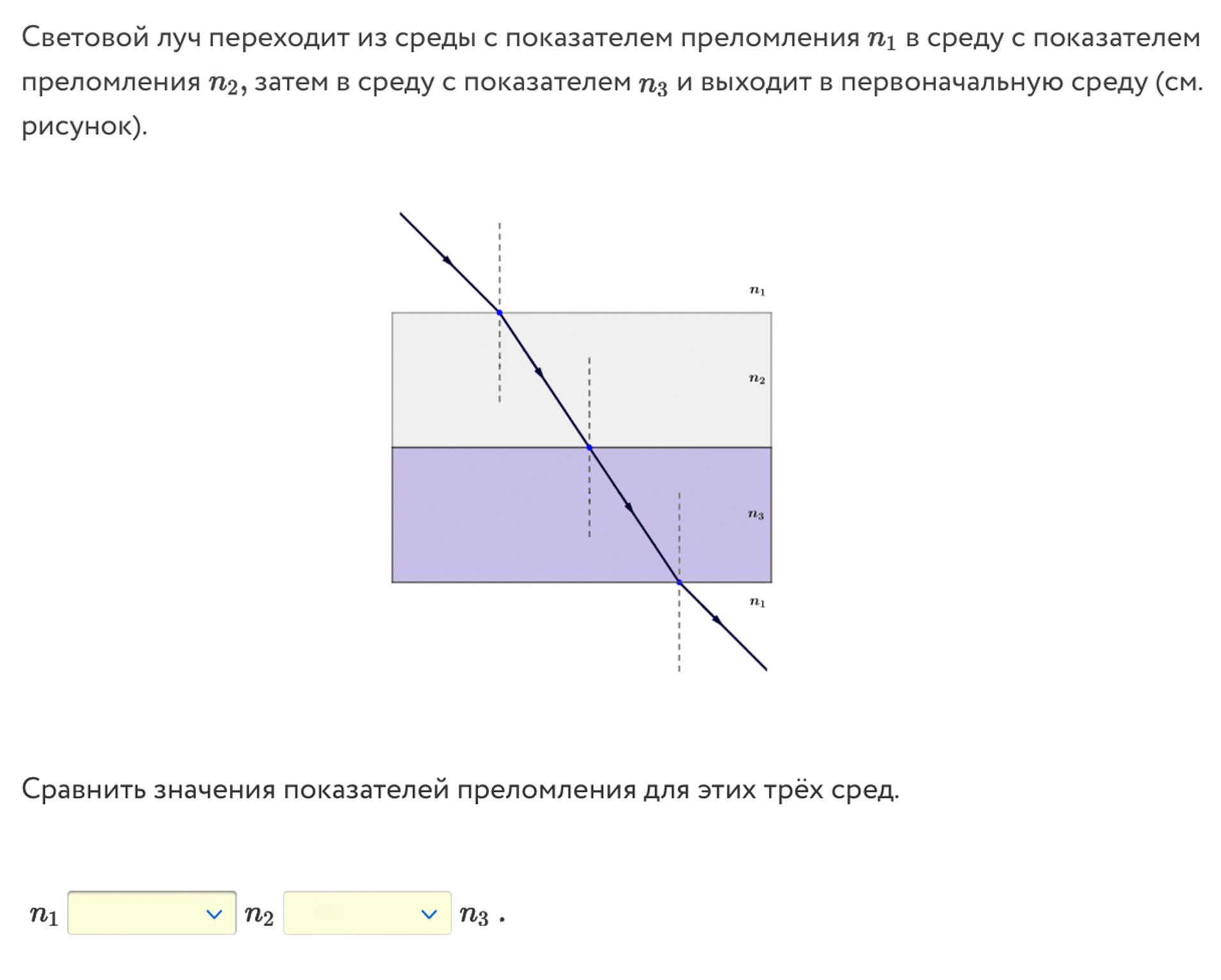 Как можно увидеть, на рисунке показано, что преломление в среде n2 и n3 одинаковы(свет не искажается пока проходит сквозь них), среда n1 же искажает свет относительно меньше, поэтому из этого можно сделать вывод: n1<n2=n3