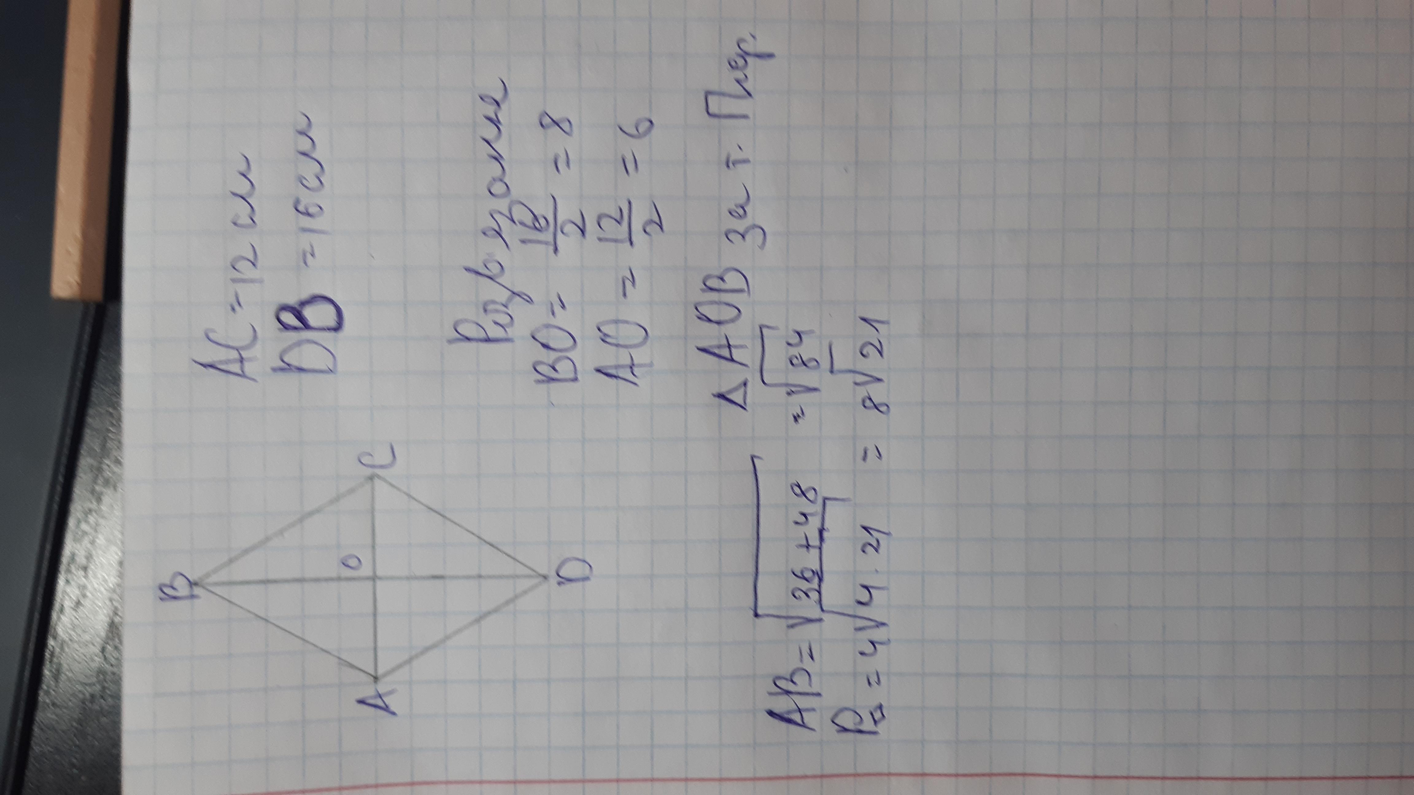 5) У ромба діагоналі 12 см і 16 см. Обчислити його сторону, а потім периметр