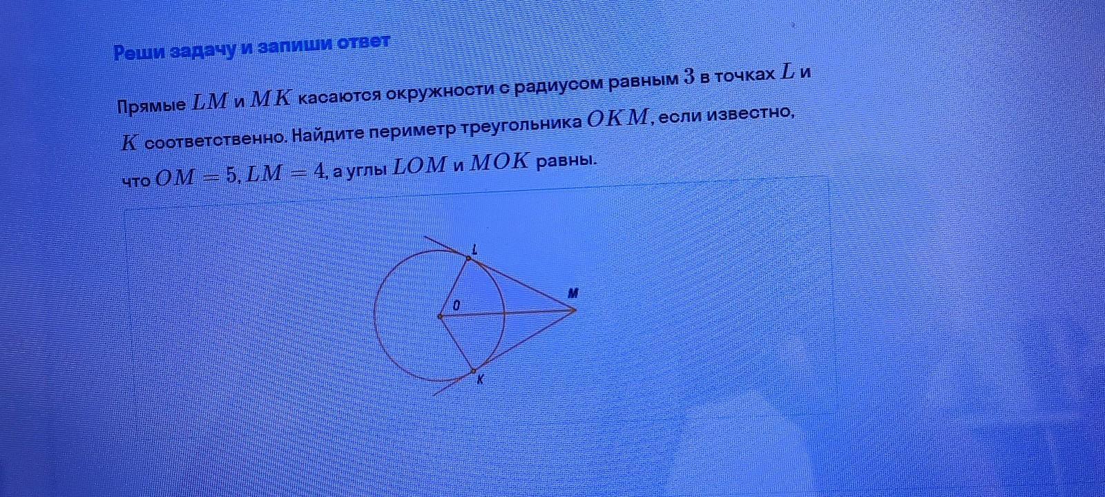 Реши задачу и запиши ответ Прямые LM и МК касаются окружности с радиусом равным 3 в точках L и К соответственно. Найдите периметр треугольника OKM, если известно, что OM = 5, LM = 4, а углы LOM и МОК равны.