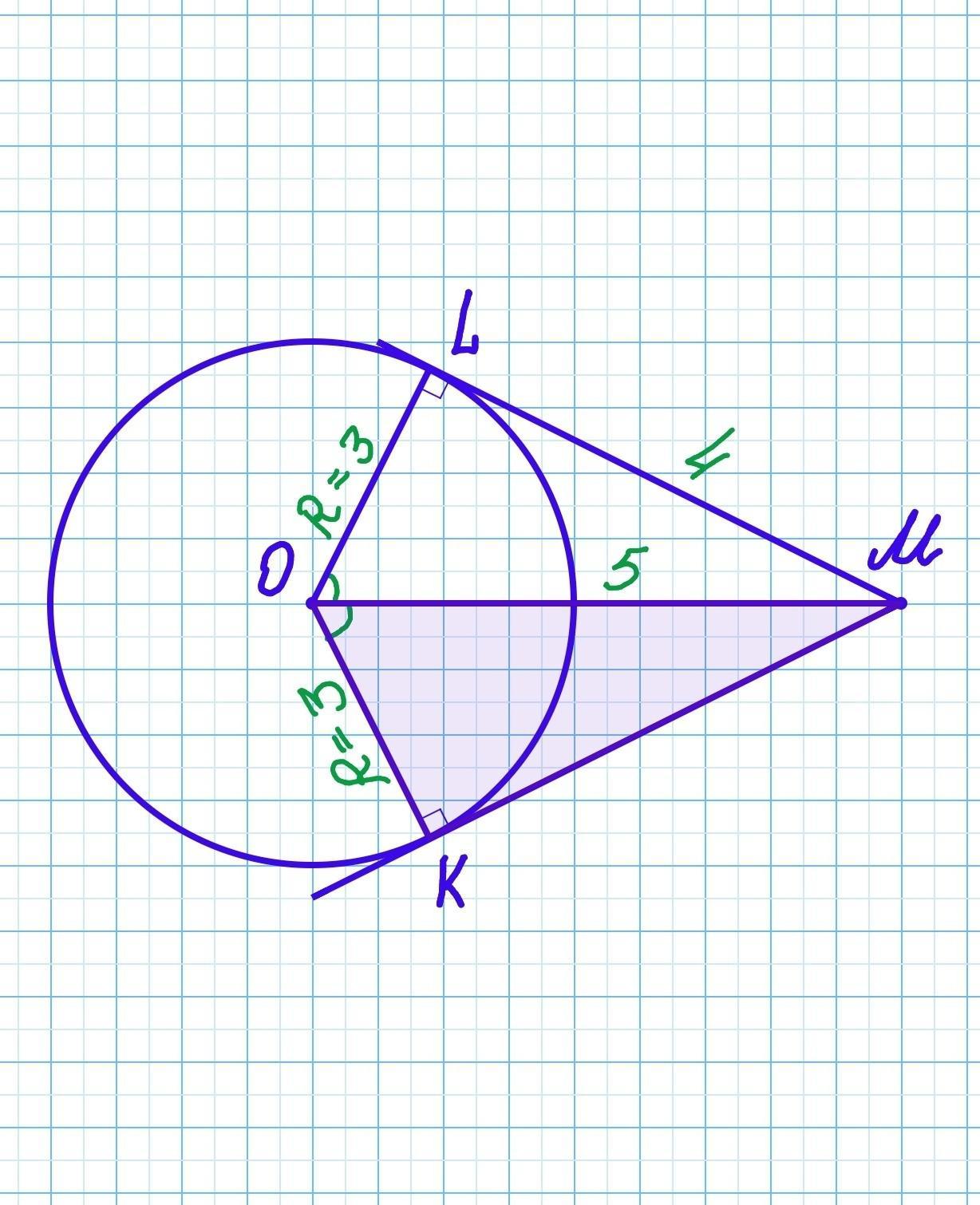Прямые LM и МК касаются окружности с радиусом равным 3 в точках L и К соответственно. Известно, что OM = 5, LM = 4, а углы LOM и МОК равны.