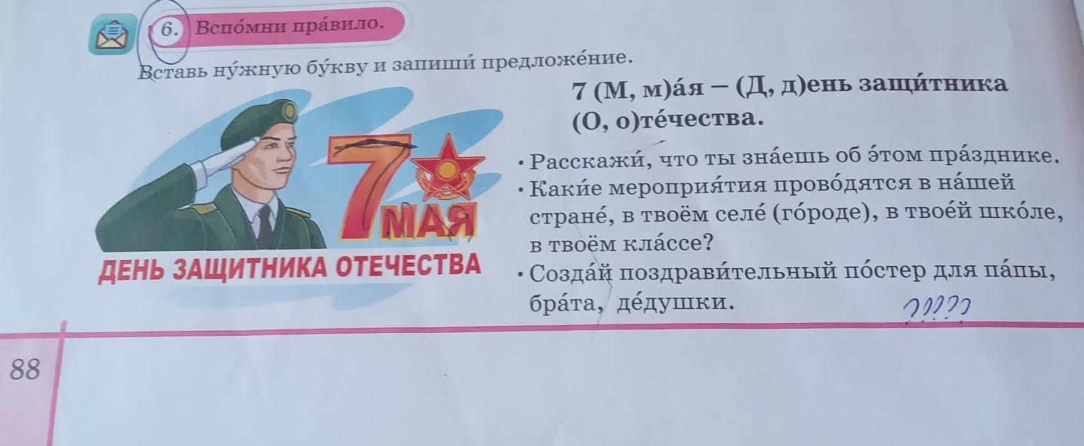 6. Вспомни правило. Вставь нужную букву и запиши предложение. 7 (м, м)äя – (Д,д)ень защитника (0, отечества. - Расскажи, что ты знаешь об этом празднике. Какие мероприятия проводятся в нашей МАЯ странё, в твоём селе (городе), в твоей школе, в твоём классе? ДЕНЬ ЗАЩИТНИКА ОТЕЧЕСТВА • Создай поздравительный постер для папы, брата, дедушки.