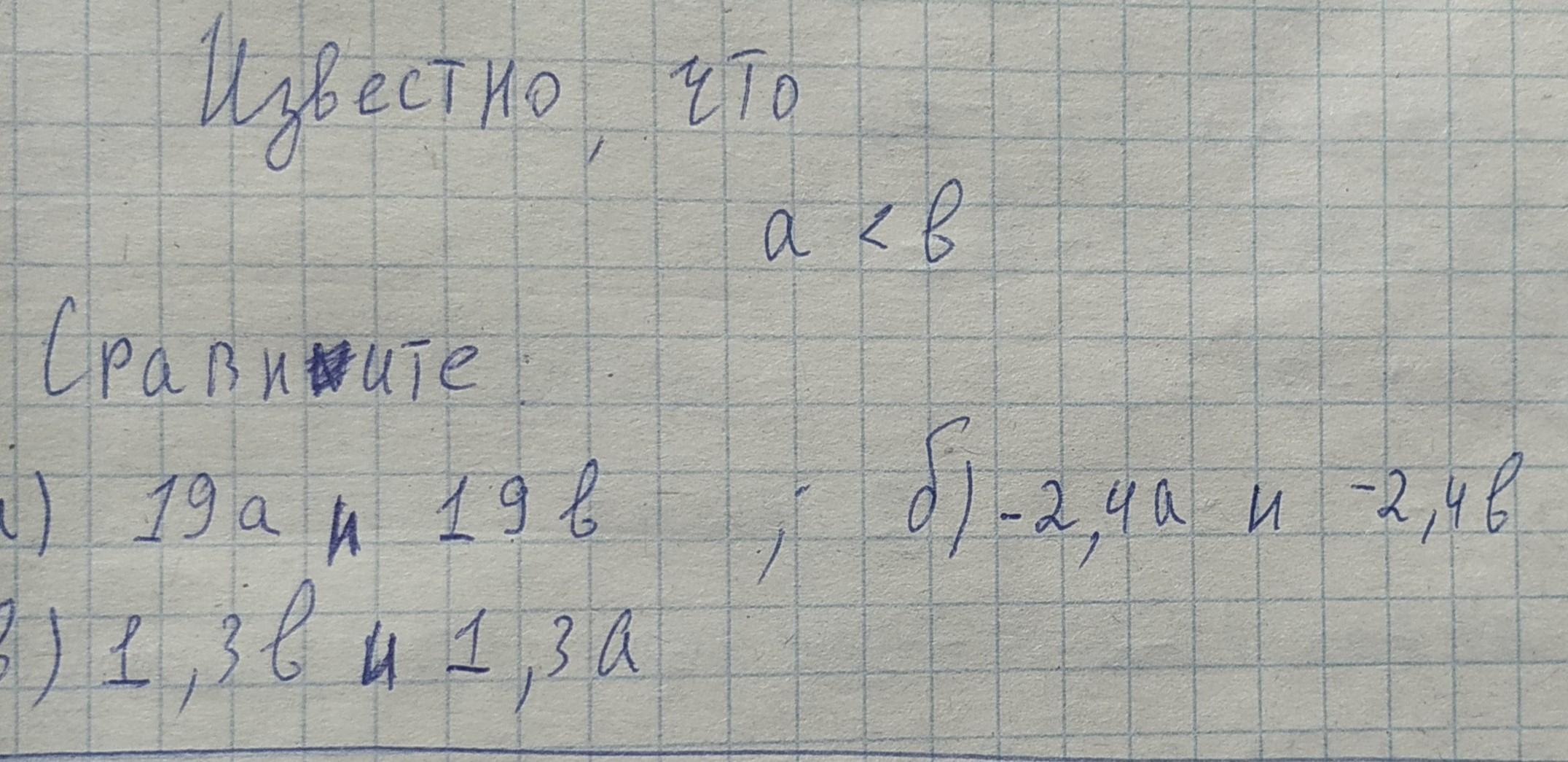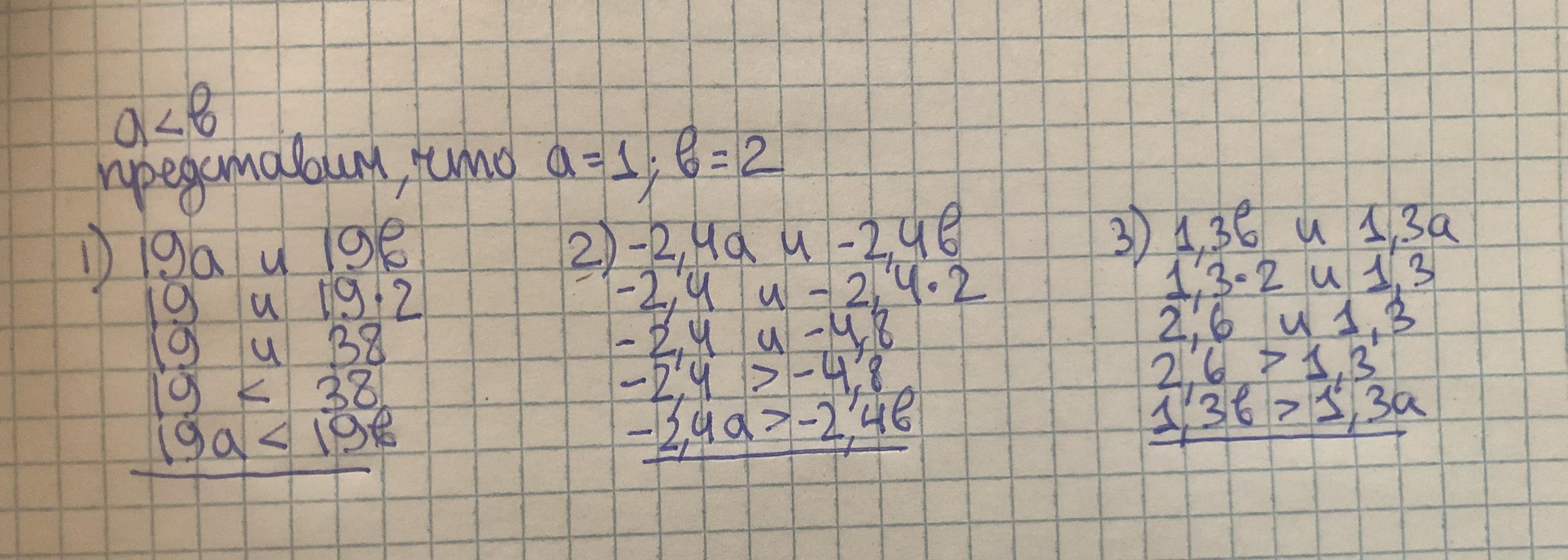 Ответ: 19а < 19b; -2,4a > -2,4b; 1,3b > 1,3a