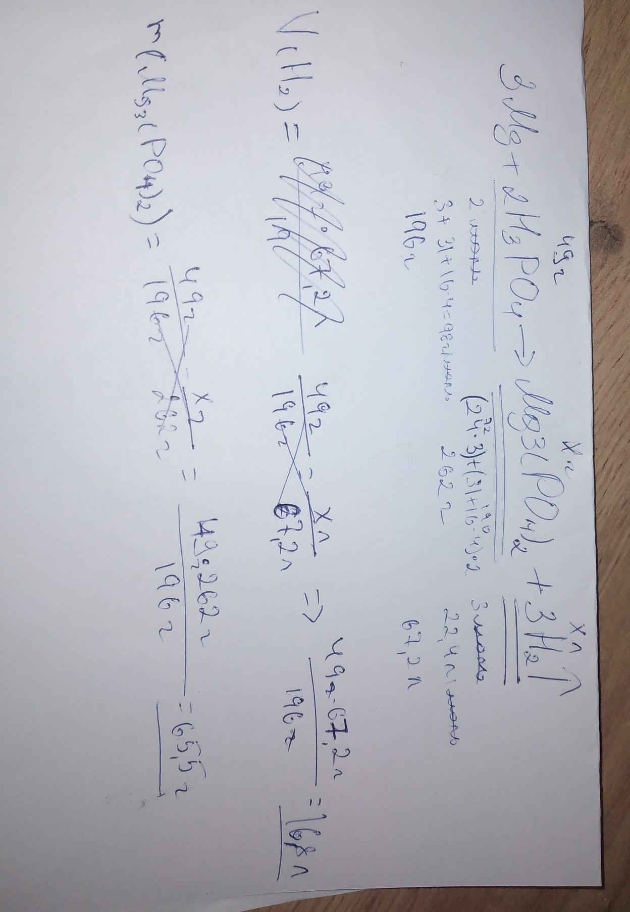 Решите задачу. Какой объем водорода (н. у.) и массу фосфата магния можно получить при взаимодействии магния с фосфорной кислотой массой 49 г. (Ответ: 16,8 л; 65,5 г )