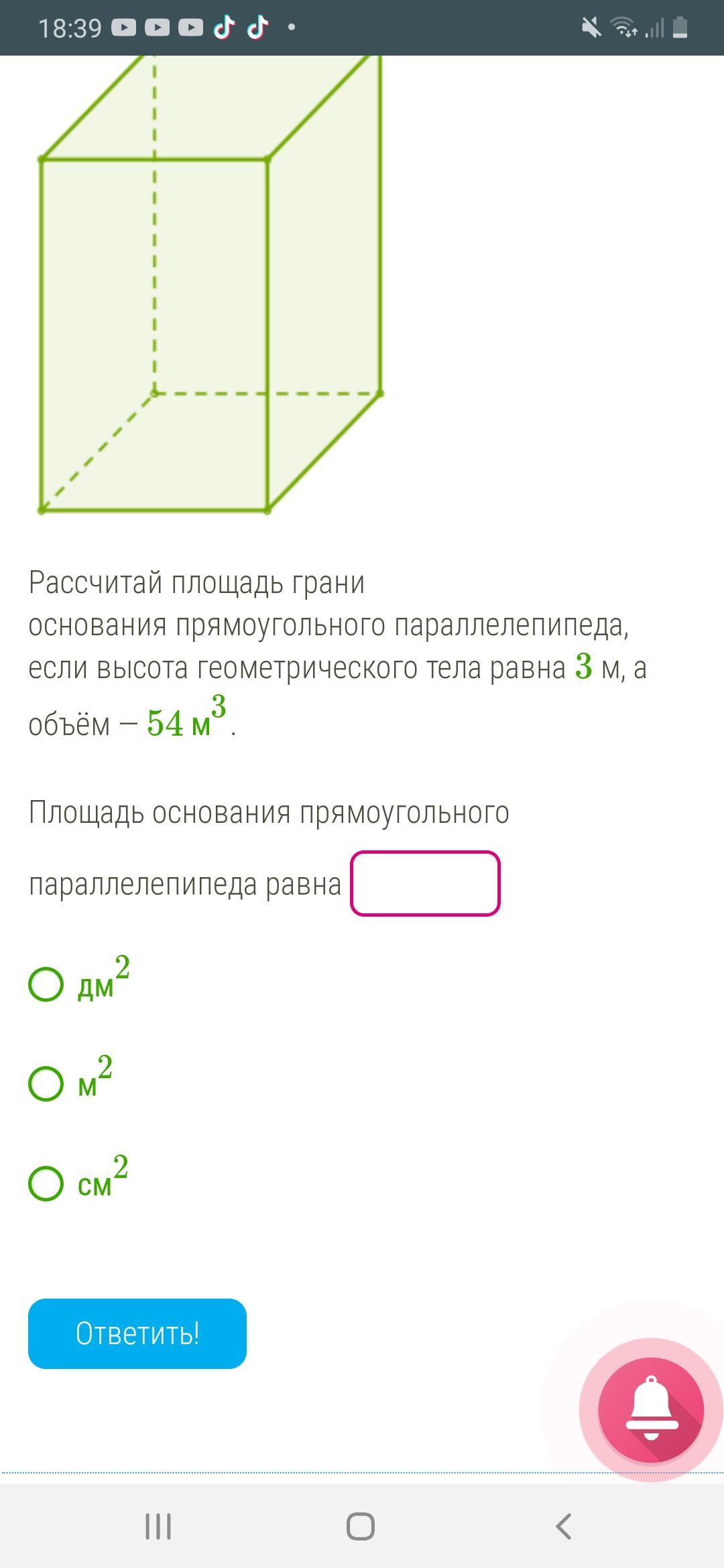 54:3=18 м^2 - площадь грани прямоугольного параллелепипеда.