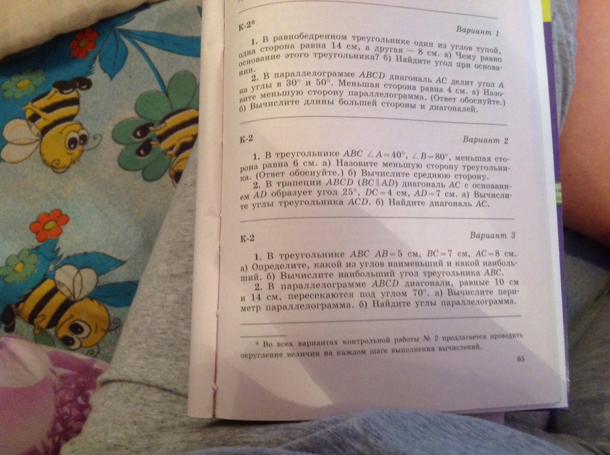 Вариант3 В треугольнике наибольший угол лежит против большей стороны, наименьший - против наименьшей стороны, треугольник АВС, АВ=5, ВС=7, АС=8, наибольший уголВ-лежит против АС=8, наименьший С-лежит против АВ=5, угол вычисляется по теореме косинусов, cosВ=(АВ в квадрате+ВС в квадрате-АС в квадрате) / (2*АВ*ВС)=(25+49-64)/(2*5*7)=10/70=1/7=0,1429, что соответствует углу 81 град47мин=82град (округленно), №2 параллелограмм АВСД, АС=14, ВД=10, О-пересечение диагоналей, уголАОВ=70, диагонали параллелограмма при пересечении делятся пополам, АО=СО=1/2АС=14/2=7, ВО=ДО=1/2ВД=10/2=5, треугольник АОВ, сторону треугольника АВ находим по теореме косинусов, АВ в квадрате=ВО в квадрате+АО в квадрате-2*ВО*АО*cos угла АОВ=25+49-2*5*7*0,342=50,06, АВ=7,08, АВ=7 (округленно), значения косинуса находим в таблицах, треугольник АОВ равнобедренный, АВ=АО=7, уголАОВ=уголАВО=70, уголВАО=180-70-70=40, треугольник АОД, АД в квадрате=АО в квадрате+ДО в квадрате-2*АО*ДО*cos угла АОД, уголАОД=180-уголАОВ=180-70=110, АД в квадрате=49+25-2*7*5*(-0,342)=74+23,94=97,94, АД=9,9, АД=10 (округленно), периметрАВС=2*(АВ+АД)=2*(7+10)=34, треугольник АОД, углы находим по теореме синусов, ДО/sinОАД=АД/sinАОД, 5/sinОАД=10/0,94, sinОАД=5*0,94/10=0,47 -что соответствует углу 28 град(округленно), уголА=уголВАО+уголОАД=40+28=68=уголС, уголВ=уголД=180-уголА=180-68=112, синусы берем из таблиц (в сноске говорится об округленных значениях, правда не сказано до каких значений)