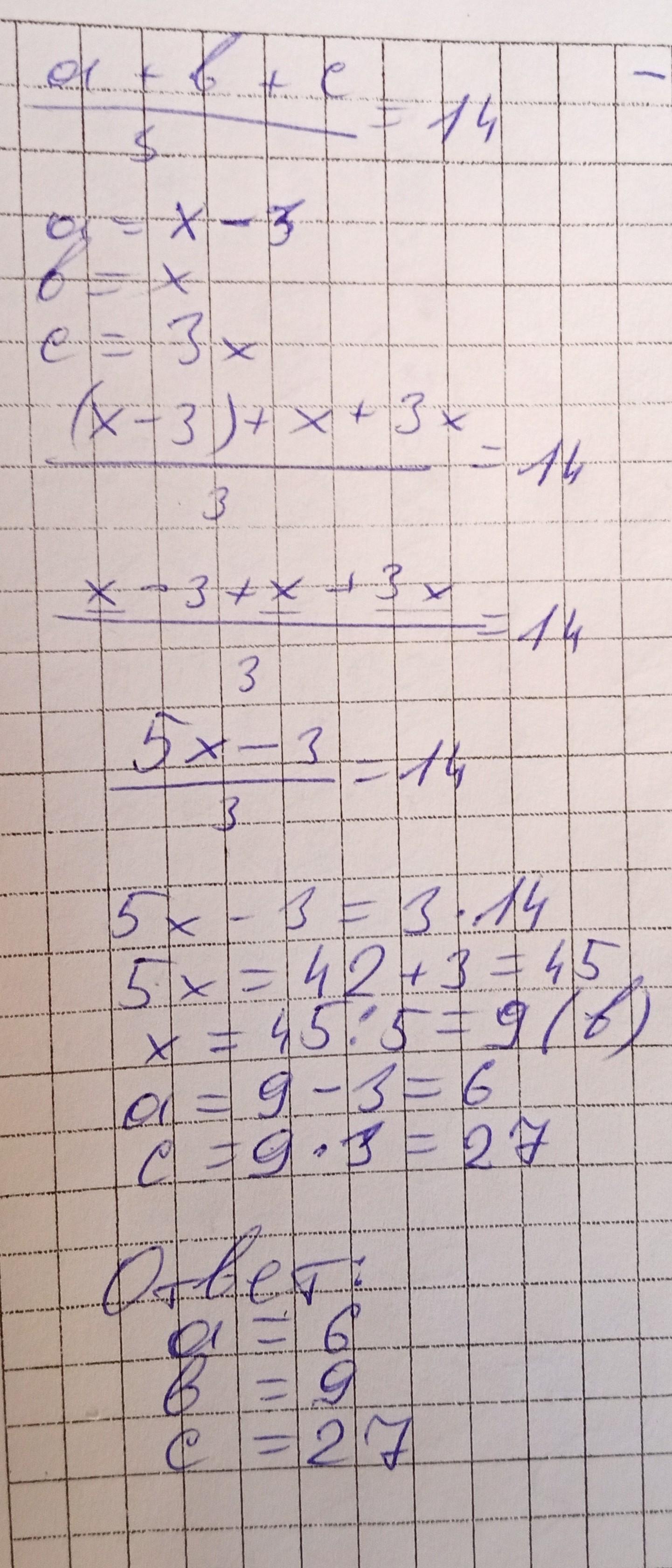 Среднее арифметическое трёх чисел ровно 14. Найдите эти числа, если первое число на 3 меньше второго, а третье в 3 раза больше второго