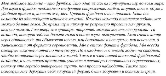 Моё любимое занятие - это футбол. Это одна из самых популярных игр во всём мире. Для игры в футбол необходимо следующие снаряжение:майка,шорты, носки, обувь и удобные щитки и, конечно же, мяч. Правила футбола очень просты. Есть две команды из одиннадцати игроков в каждой. Каждая команда пытается забить как можно больше голов. Во время игры никому не разрешено трогать мяч руками, только ногами. Голкипер, или вратарь, напротив, может ловить мяч руками. Та команда, которая забьёт больше голов в конце игры, выигрывает. Если счёт в конце игры одинаковый, то объявляю ничью, или дополнительное время, или пинальти, в зависимости от формата соревнований. Мы с отцом фанаты футбола. Мы всегда смотрим важные матчи по телевизору. По выходным