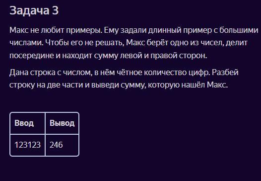 Дана строка с числом, в нём чётное количество цифр. Разбей строку на две части и выведи сумму, которую нашёл Макс.