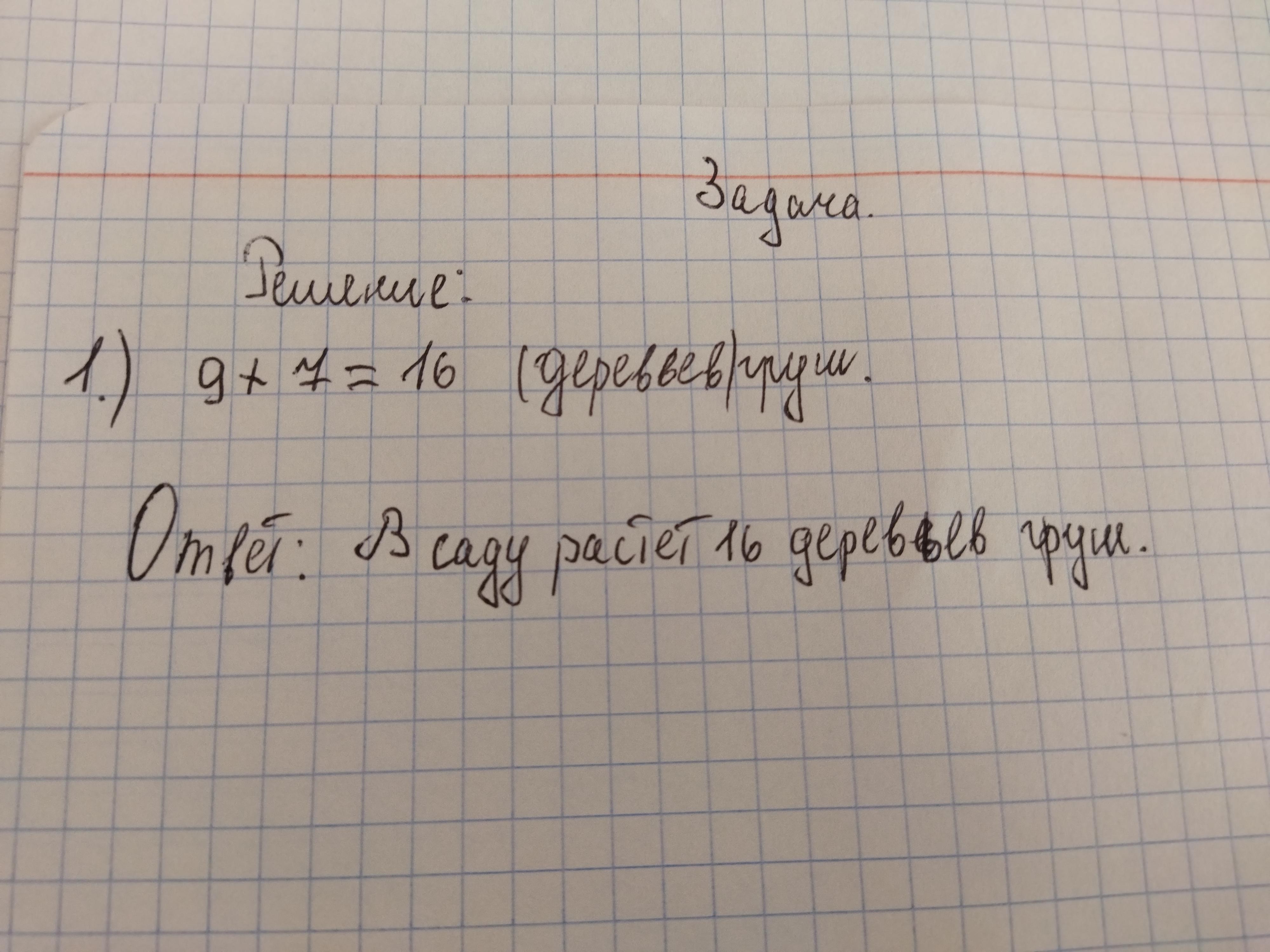 в саду растут 9 яблонь и груш .сколько груш растет в саду если известно что груш на 7 деревьев больше чем яблонь.как правильно записать задачу .