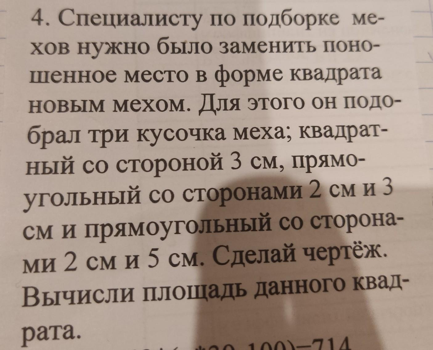 4. Специалисту по подборке ме- хов нужно было заменить поно- шенное место в форме квадрата новым мехом. Для этого он подо- брал три кусочка меха; квадрат- ный со стороной 3 см, прямо- угольный со сторонами 2 см и 3 см и прямоугольный со сторона- ми 2 см и 5 см. Сделай чертёж. Вычисли площадь данного квад- рата.