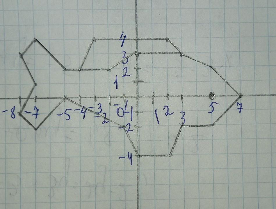 Побудуйте фігуру за координатами: (3;3),(0;3),(-2;2),(-5;2),(-7;4),(-8;3),(-7;1),(-8;-1),(-7;-2),(-5;0),(-1;-2),(0;-4),(2;-4),(3;-2),(5;-2),(7;0),(5;2),(3;3),(2;4),(-3;4),(-4;2)