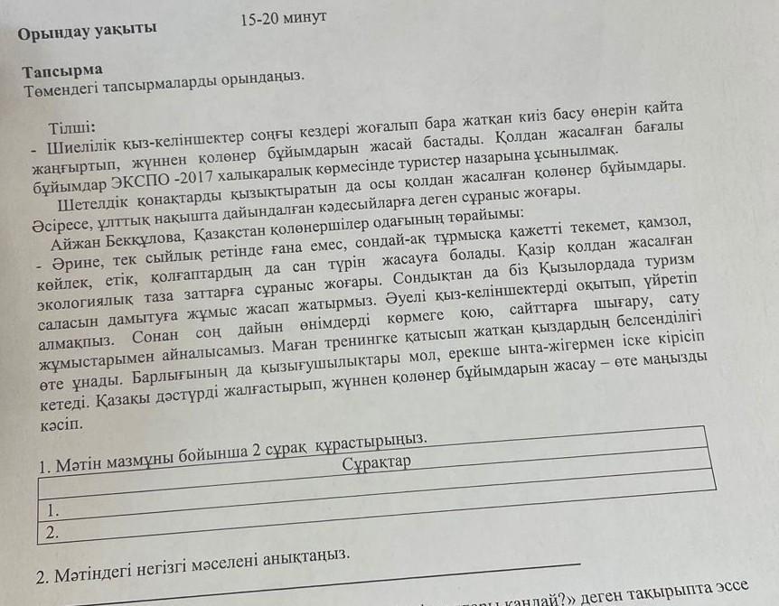 2. Мәтіндегі негізгі мәселе: Қазақ халқының өзінің ұлттық құндылықтарын, өнерін ұмытпау.