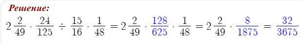 2\frac{2}{49}\cdot \frac{24}{125}\div \frac{15}{16}\cdot \frac{1}{48}=2\frac{2}{49}\cdot \frac{128}{625}\cdot \frac{1}{48}=2\frac{2}{49}\cdot \frac{8}{1875}=\frac{32}{3675}