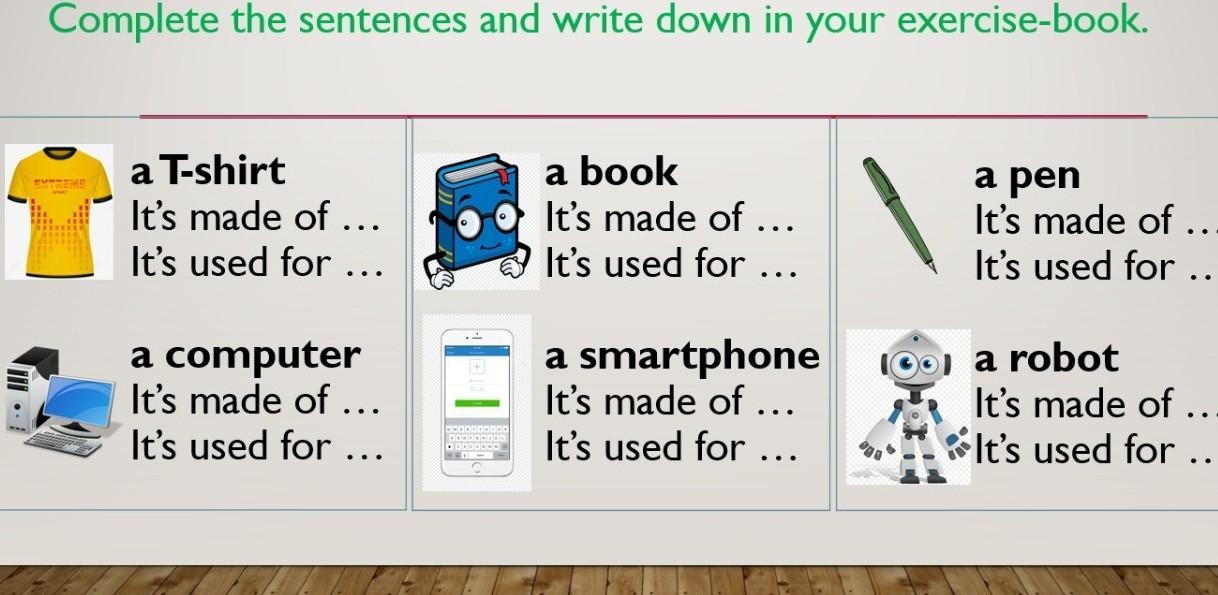 Complete the sentences and write down in your exercise-book. a T-shirt It's made of ... It's used for ... a book It's made of ... a pen It's made of ... It's used for ... It's used for ... 10o) a robot a computer It's made of ... It's used for ... a smartphone It's made of ... It's used for ... It's made of ... It's used for ...