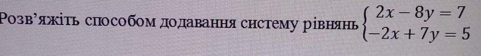 Привабляем все части системы уравнений и складываем их между собой. Сокращаем 2x и -2х, зачем сокращаем -8y и 7y, затем складываем суммы (7+5)