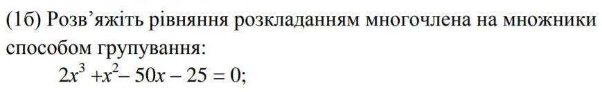 \displaystyle\bf\\2x^{3} +x^{2} -50x-25=0\\\\(2x^{3} +x^{2}) -(50x+25)=0\\\\x^{2} (2x+1)-25(2x+1)=0\\\\(2x+1)(x^{2} -25)=0\\\\2(x+0,5)(x-5)(x+5)=0\\\\\\\left[\begin{array}{ccc}x+0,5=0\\x-5=0\\x+5=0\end{array}\right\\\\\\\left[\begin{array}{ccc}x_{1}=-0,5\\x_{2} =5\\x_{3} =-5\end{array}\right\\\\\\Otvet: \ -0,5 \ ; \ 5 \ ; \ -5