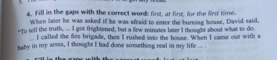 4. Fill in the gaps with the correct word: first, at first, for the first time. When later he was asked if he was afraid to enter the burning house, David said, "To tell the truth.... I got frightened, but a few minutes later I thought about what to do. I called the fire brigade, then I rushed into the house. When I came out with a baby in my arms, I thought I had done something real in my life ....