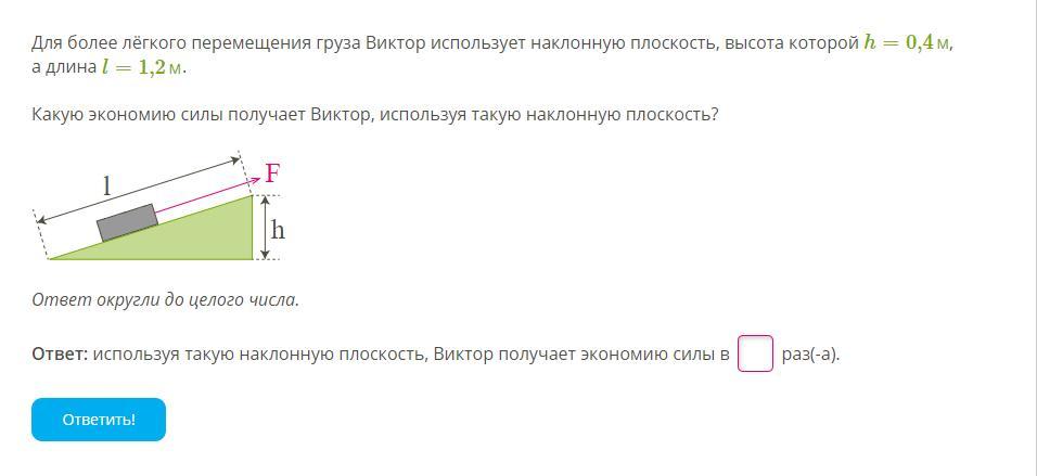 Для более лёгкого перемещения груза, Виктор использует наклонную плоскость, высота которой h=0,4м и длина равна l=1,2м.Какую экономию силы получает Виктор, используя такую наклонную плоскость?