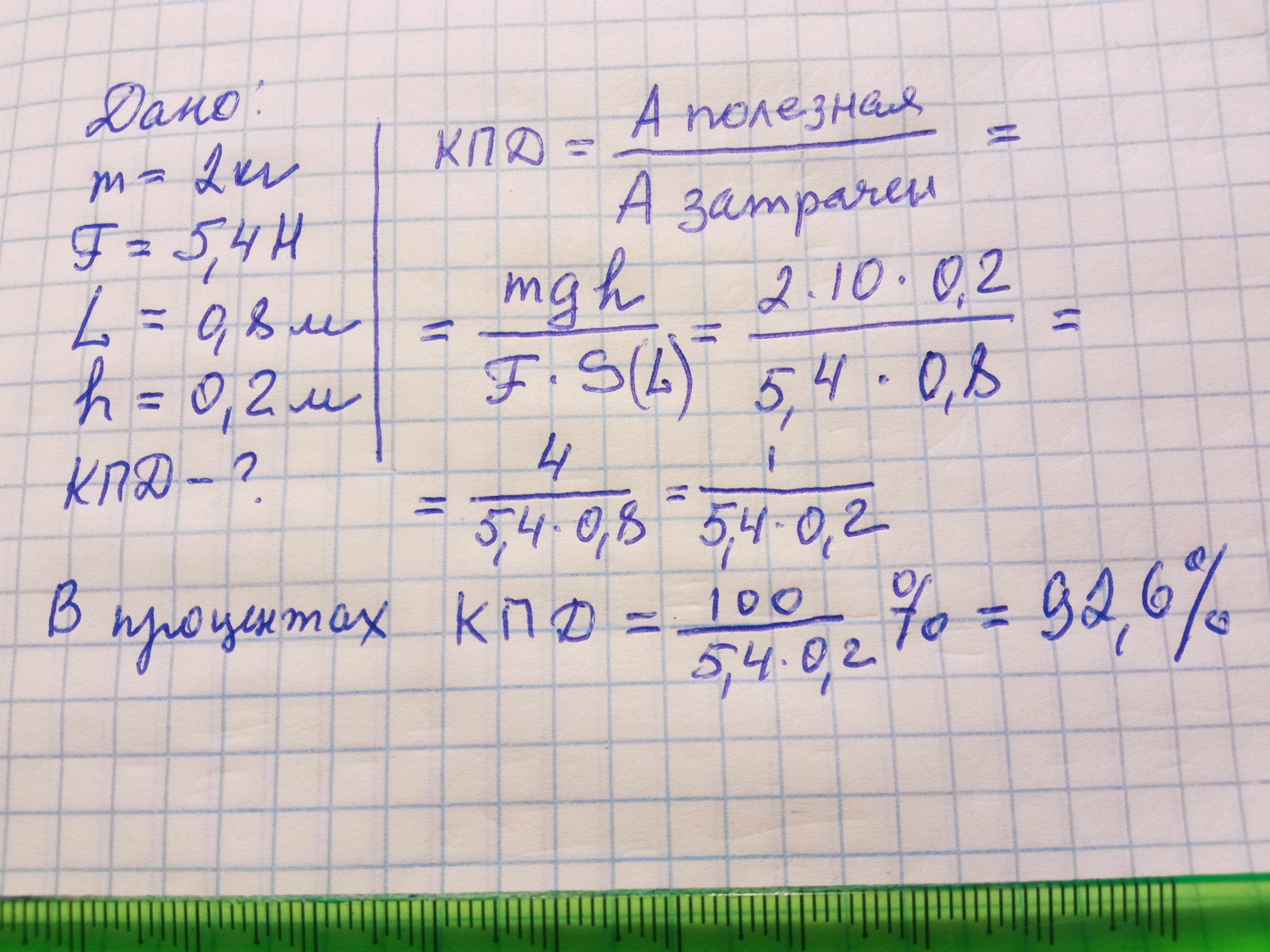 Школьник, перемещая равномерно по наклонной доске груз массой 2 кг, приложил силу 5,4 Н. Каково значение КПД конструкции, если длина доски 0,8 м и высота над горизонтальным уровнем 0,2 м? (Принять g≈10Нкг).