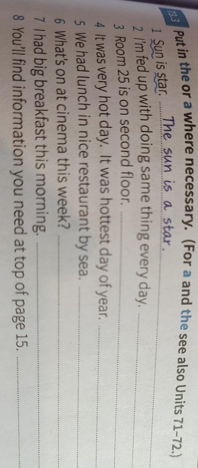 1.The sun is a star. 2. I'm fed up with doing same thing every day. 3 Room 25 is on second floor. 4 it was very hot day. It was hottest day of year. 5 We had lunch in nice restaurant by sea. 6 What's on at cinema this week? 7 I had big breakfast this morning. 8 You'll find information you need at top of page 15